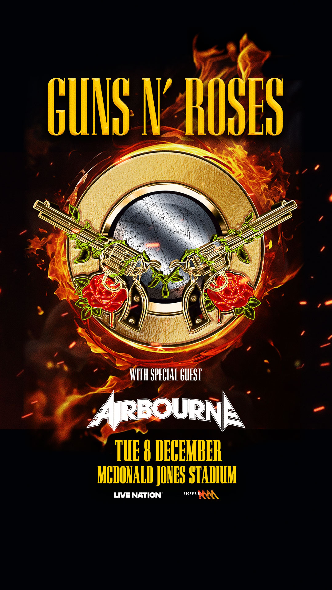 Joined by special guests Airbourne, this stadium show promises a night of career-defining hits, iconic guitar riffs, and the high-octane energy that has made Guns N’ Roses one of the most celebrated rock bands in history.